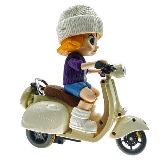 Papusa pe motocicleta cu sunete si lumini este o jucarie super distractiva. Se deplaseaza in timp ce canta o melodie si proiecteaza lumini. La intalnirea unui obstacol aceasta isi schimba directia, astfel incat va merge continuu. Fetita motociclist poate vira la stanga, la dreapta si poate merge doar pe rotile din spate.