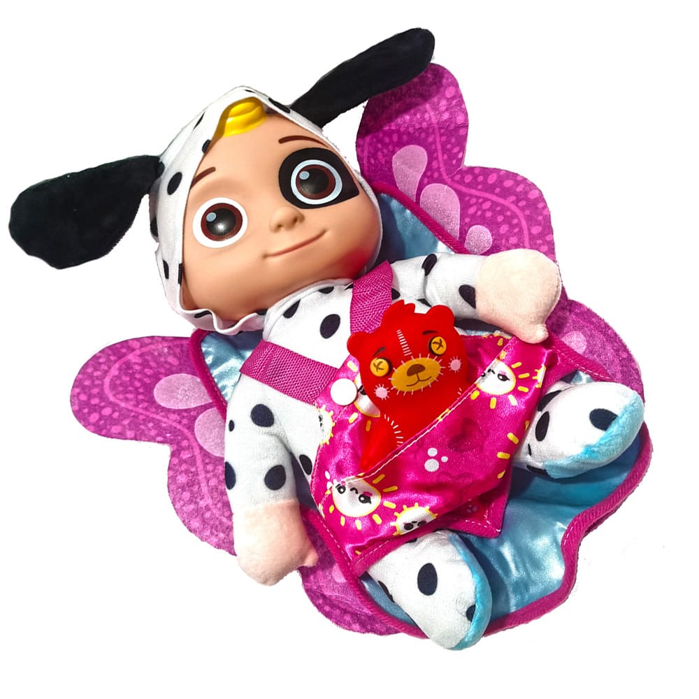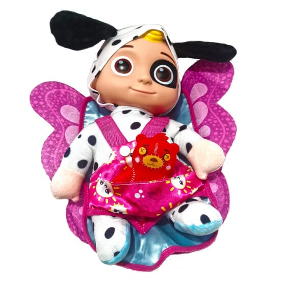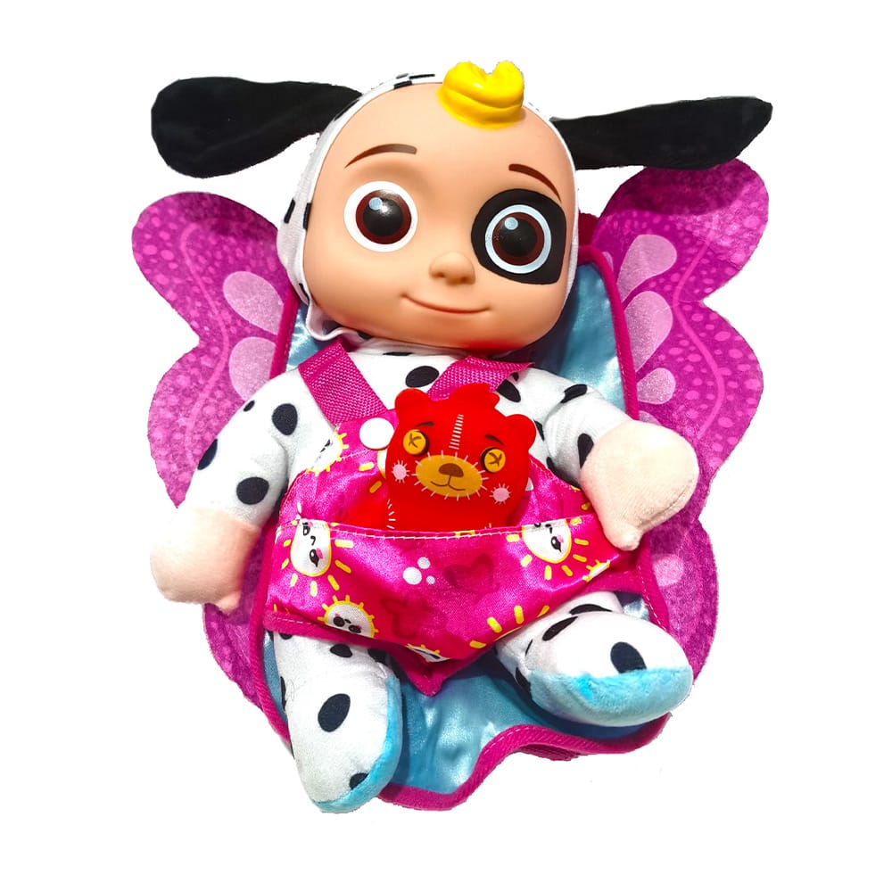 La apasarea pe spatele papusii, aceasta va canta un fragment de cantecel din desenul animat pe care il reprezinta (Cocomellon).