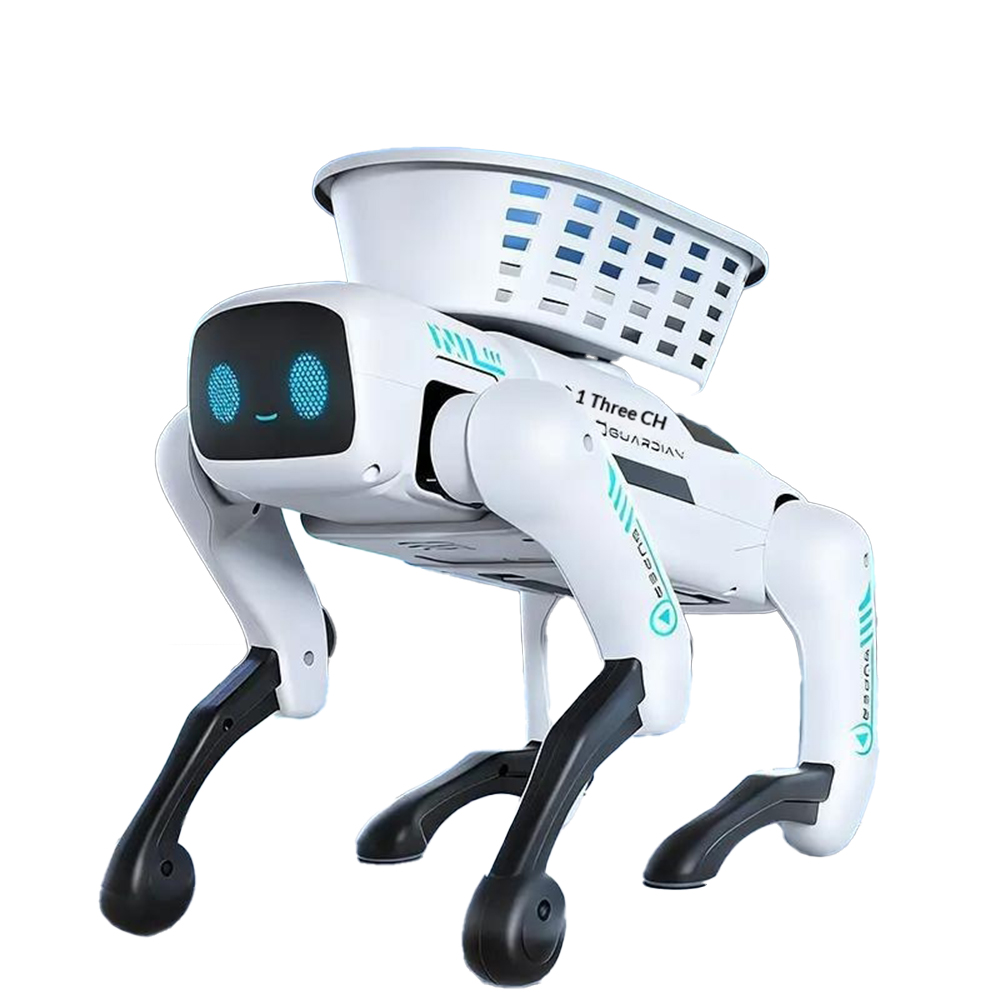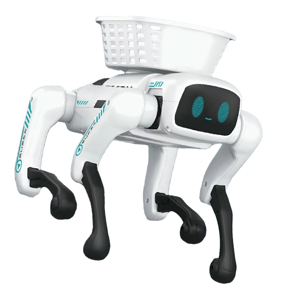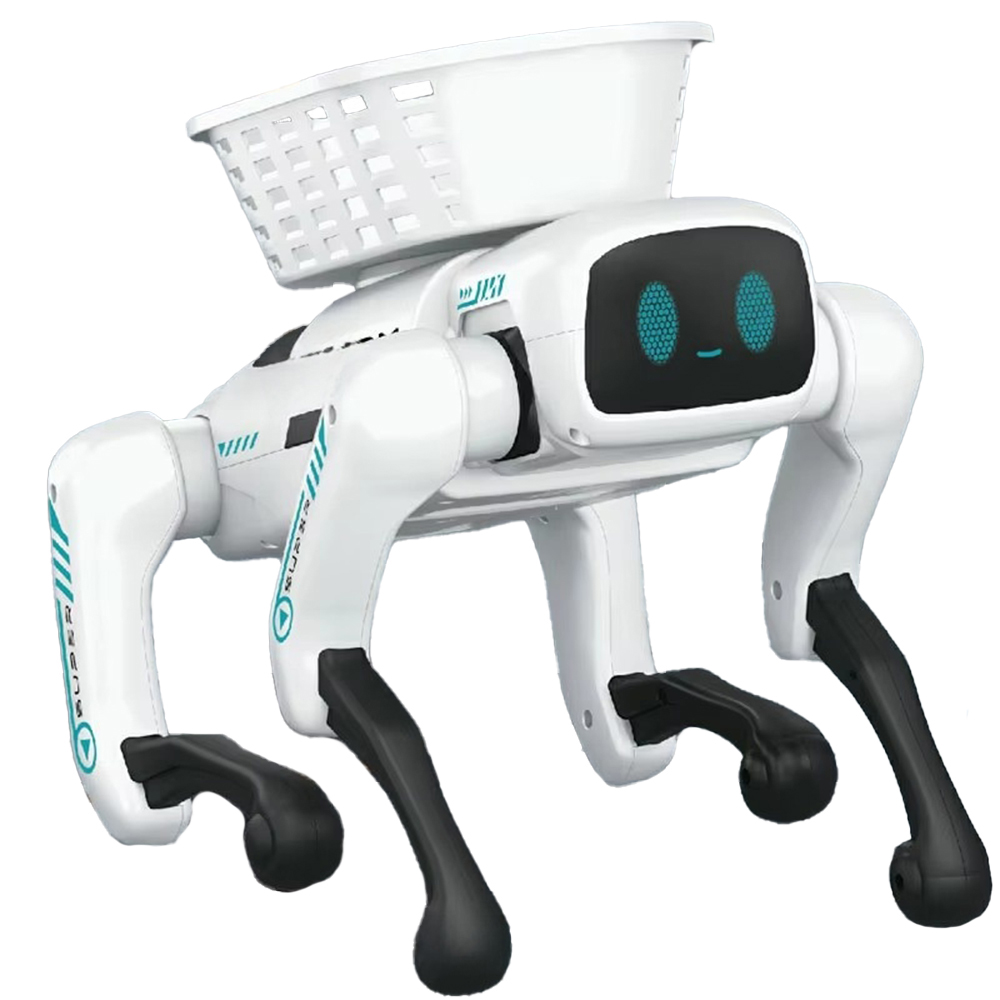 Design tip robot caine – modern, atractiv si captivant pentru copii. Include cosulet accesoriu care poate transporta obiecte mici pentru o joaca creativa.